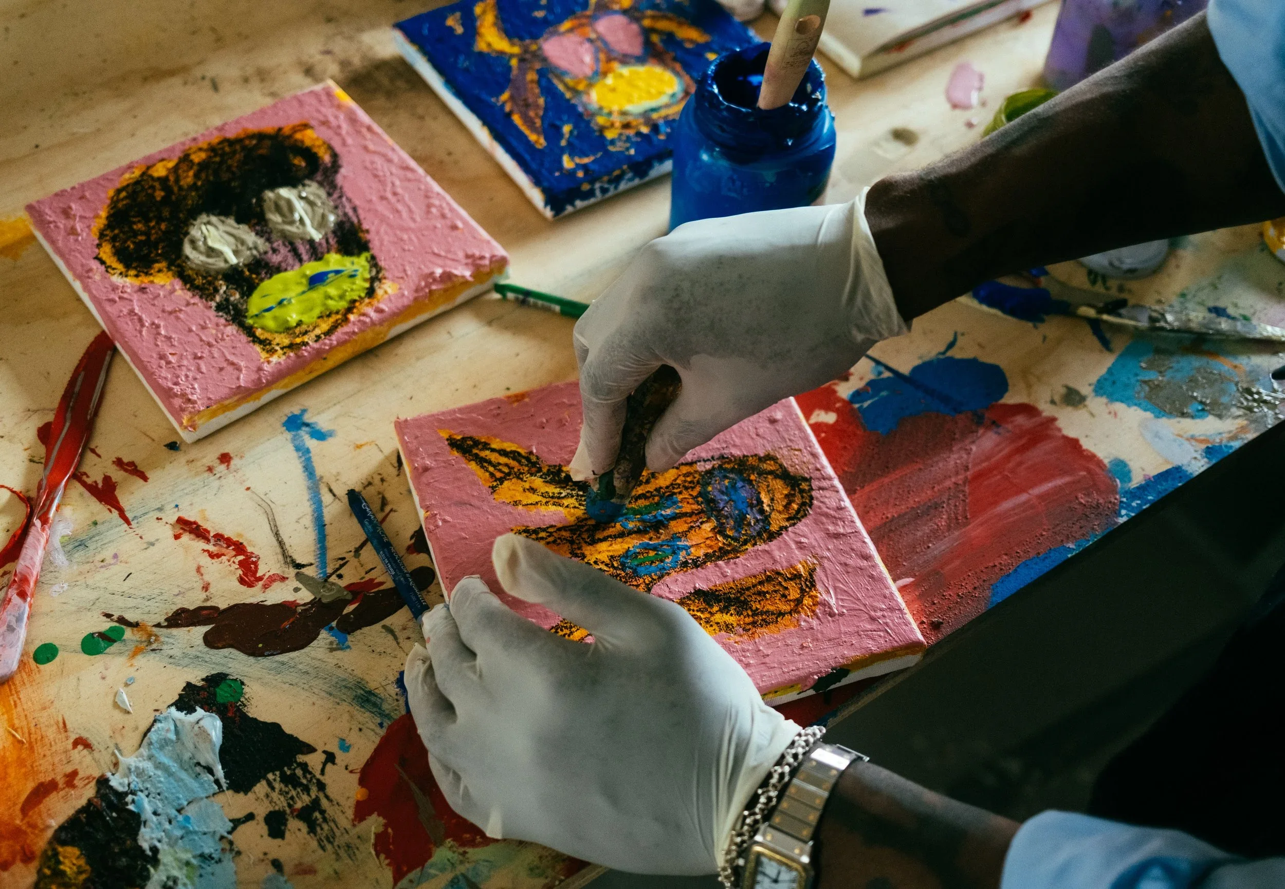 Photographed in his raw and authentic studio environment, the images reflect Kabangu’s expressive process — painting with bold gestures, mixing sand into his materials, and working to anything but mainstream music.